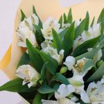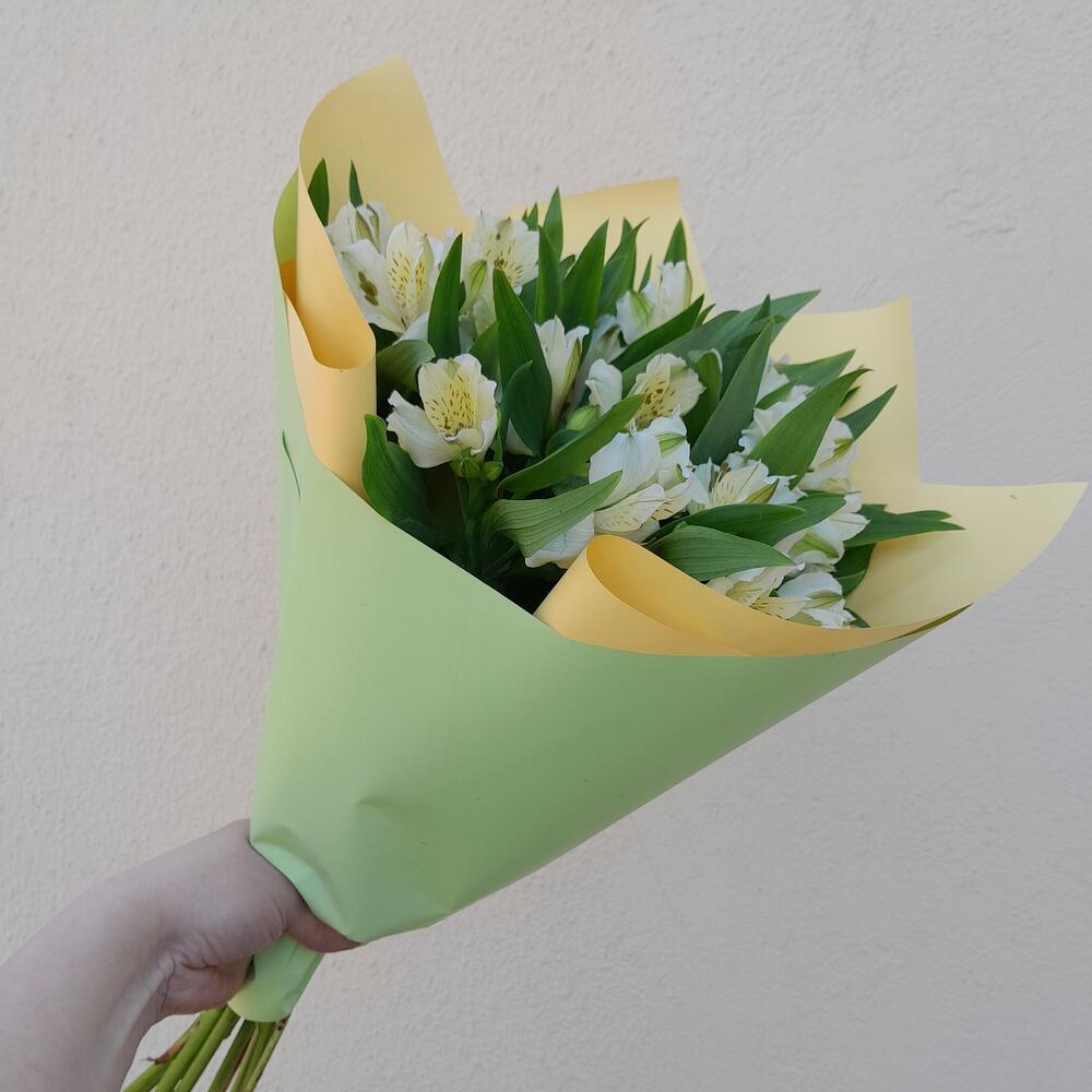Альстромерия – 7 шт.Салал – 3 шт.Лента атласная – 2 шт.Упаковка дизайнерская – 3 шт.