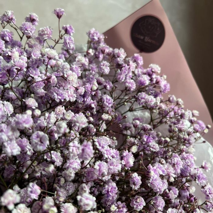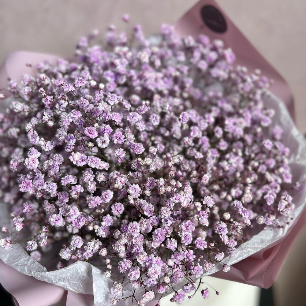 гипсофила лиловая – 7 шт.Дизайнерская упаковка – 1 шт.Атласная лента – 1 шт.