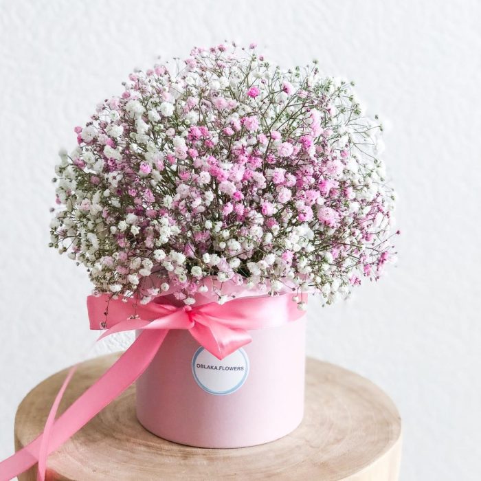 “Сиреневый туман” – композиция из гипсофилы в шляпной коробке