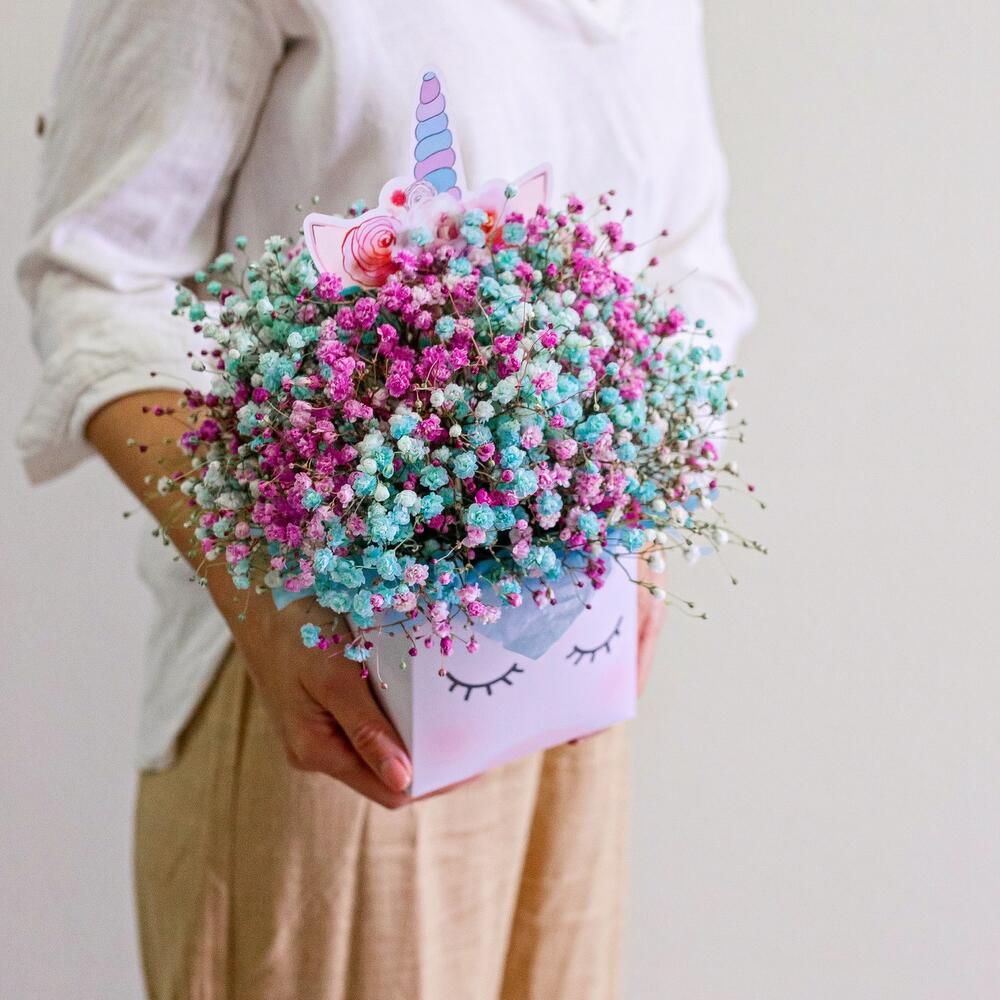 Гипсофила – 5 шт.коробка единорог – 1 шт.Оазис флористический – 1 шт.Тишью – 4 шт.