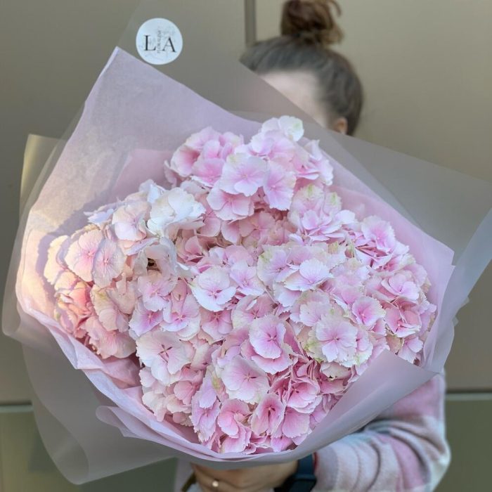 Лента атласная – 2 шт.Тишью – 2 шт.Упаковка дизайнерская – 4 шт.Гортензия розовая – 5 шт.