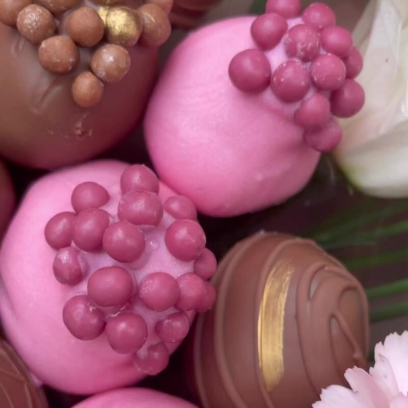 эустома белая – 6 шт.диантус нежно розовый – 5 шт.свежая клубника в бельгийском шоколаде – 450 гр.