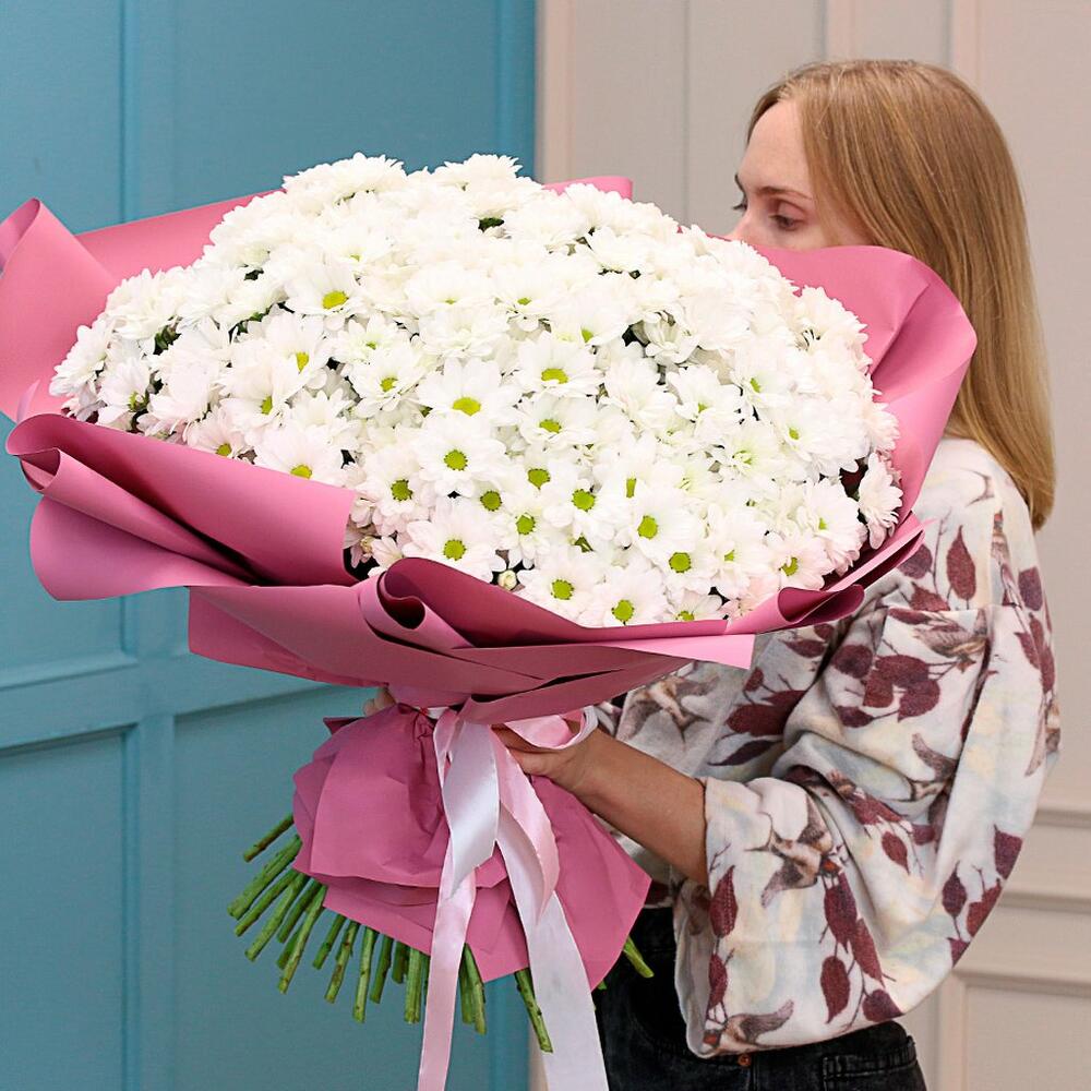 Букет из 51 белой кустовой хризантемы Бакарди в дизайнерской упаковке