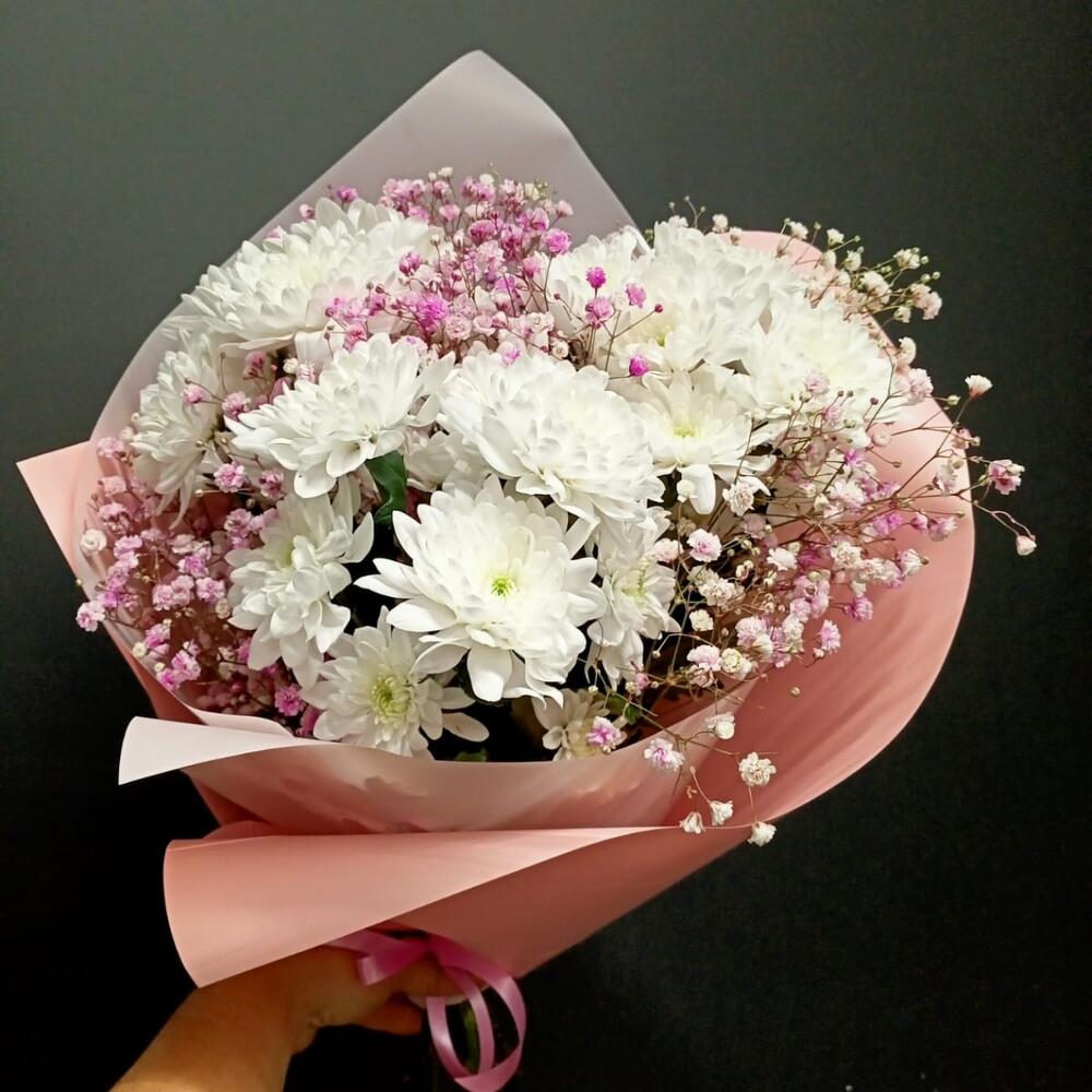 Гипсофила – 2 шт.Хризантема кустовая – 3 шт.Упаковка дизайнерская – 1 шт.