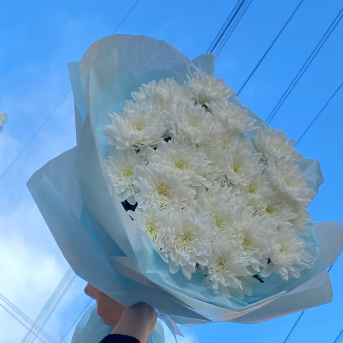 Хризантема кустовая белая – 5 шт.Тишью – 3 шт.Упаковка дизайнерская – 4 шт.лента атласная брендированная – 1 шт.