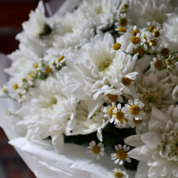 Хризантема кустовая – 3 шт.Пленка матовая – 4 шт.Матрикария (Ромашка Камила) – 5 шт.Лента репсовая – 1 шт.Калька упаковка – 4 шт.