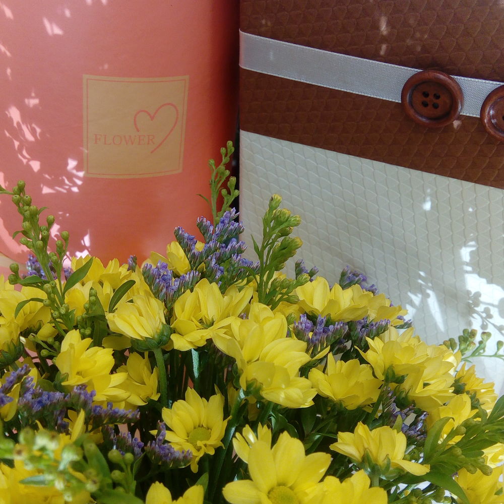 Хризантема кустовая – 15 шт.Лаванда (сухоцвет) – 33 шт.Зелень – 9 шт.Коробка шляпная – 1 шт.Оазис флористический – 1 шт.Лента – 1 шт.