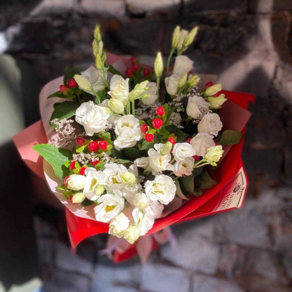 Букет из белой эустомы, лимониума и гиперикума в дизайнерской упаковке “Диор”