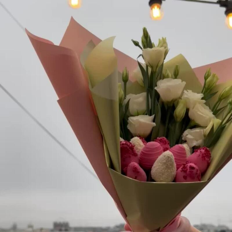 Упаковка – 1 шт.Белый лизиантус – 3 шт.клубника в бельгийском шоколаде – 300 гр.