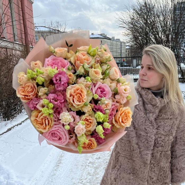 розовые пионовидные розы – 7 шт.персиковые пионовидные розы – 7 шт.садовые кустовые розы – 5 шт.Махровый лизиантус – 5 шт.Дизайнерская упаковка – 1 шт.тематическая открытка – 1 шт.