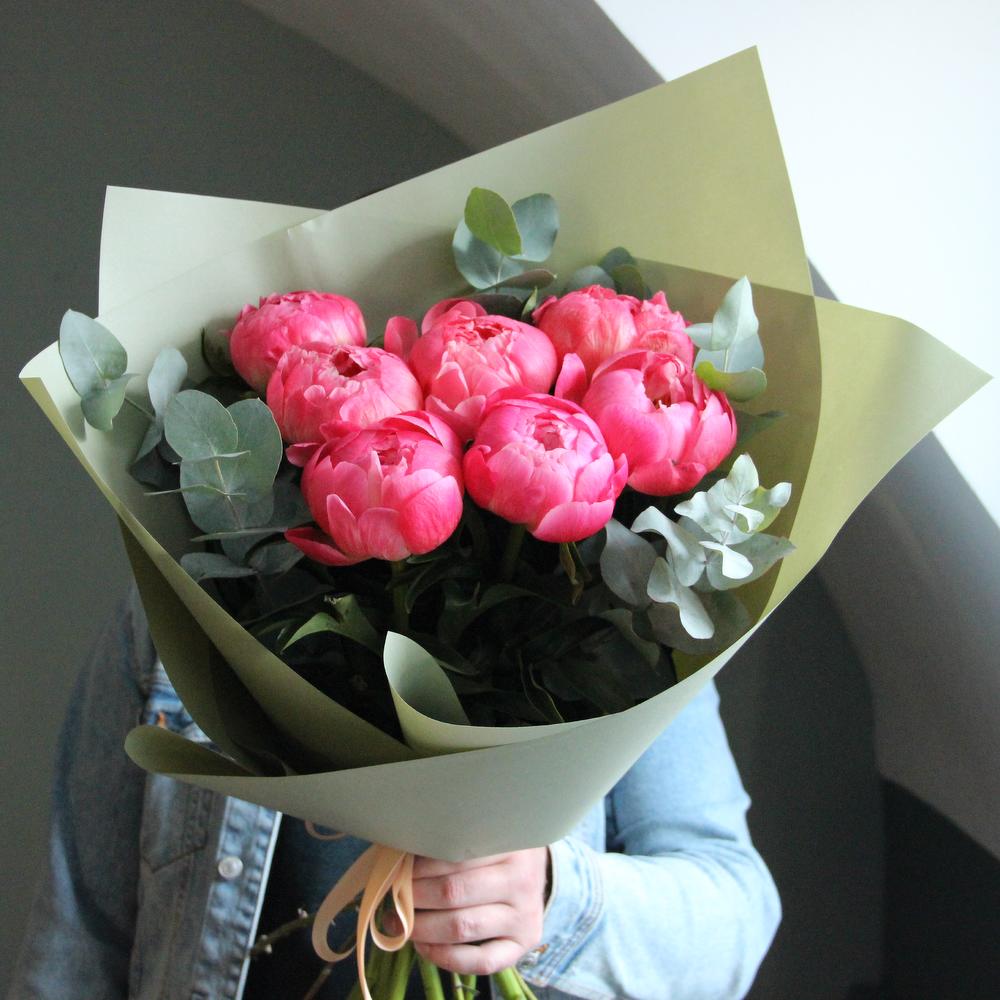 Пион – 7 шт.Эвкалипт – 5 шт.Упаковка – 2 шт.Лента атласная – 2 шт.