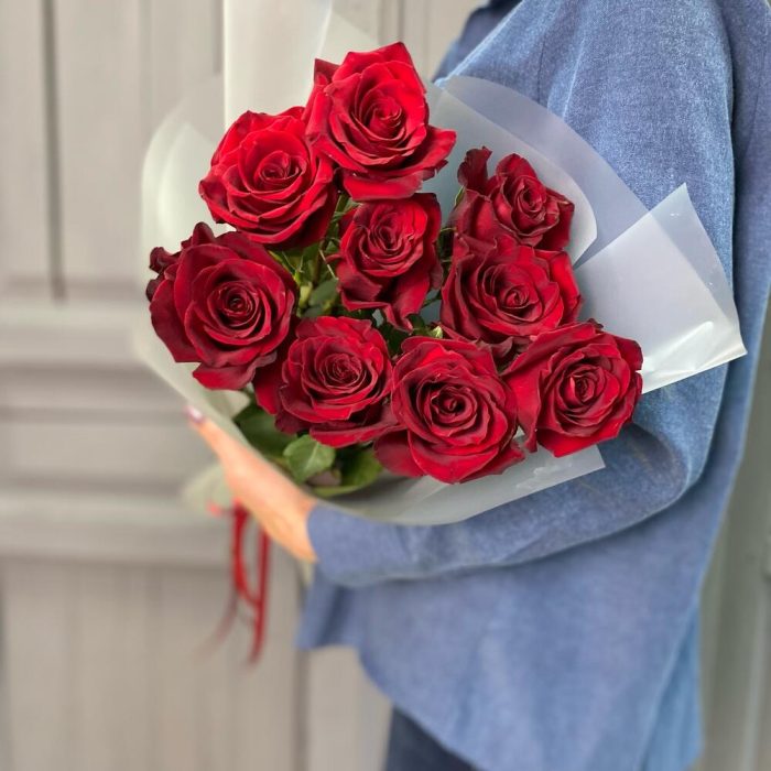 Роза красная Эквадор – 9 шт.Упаковка дизайнерская – 2 шт.Лента атласная – 2 шт.