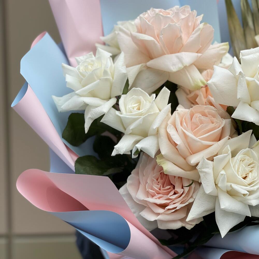 Роза Эквадор – 7 шт.Лента атласная – 2 шт.Фисташка – 3 шт.Роза пионовидная – 8 шт.Упаковка дизайнерская – 6 шт.чико крашенная – 2 шт.