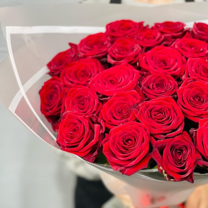 Лента атласная – 1 шт.Красная роза – 29 шт.Упаковка дизайнерская – 3 шт.