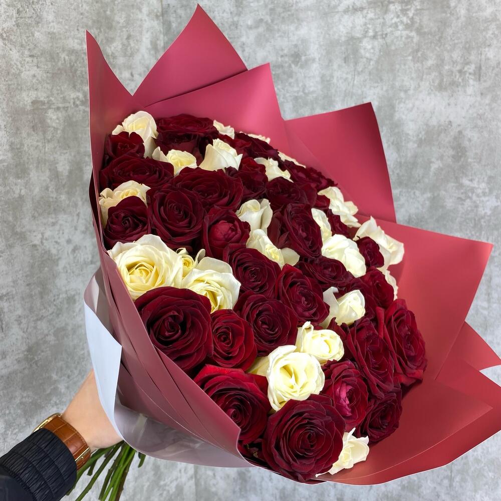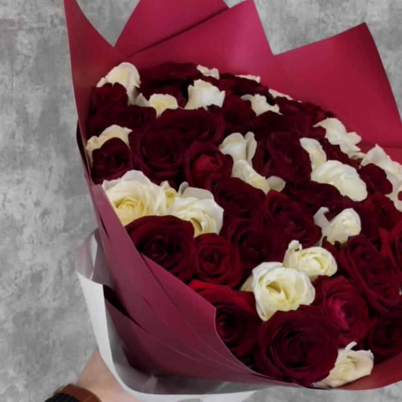 Роза красная – 38 шт.Роза белая – 21 шт.Упаковка – 3 шт.Атласная лента – 1 шт.