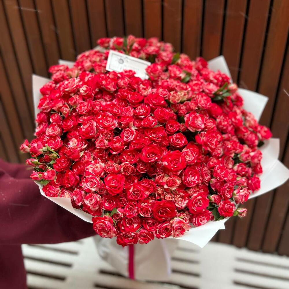 Букет из 59 кустовых роз в стильной упаковке “Пламенное приветствие”
