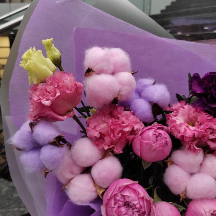 Букет из лизиантуса, хлопка и диантуса