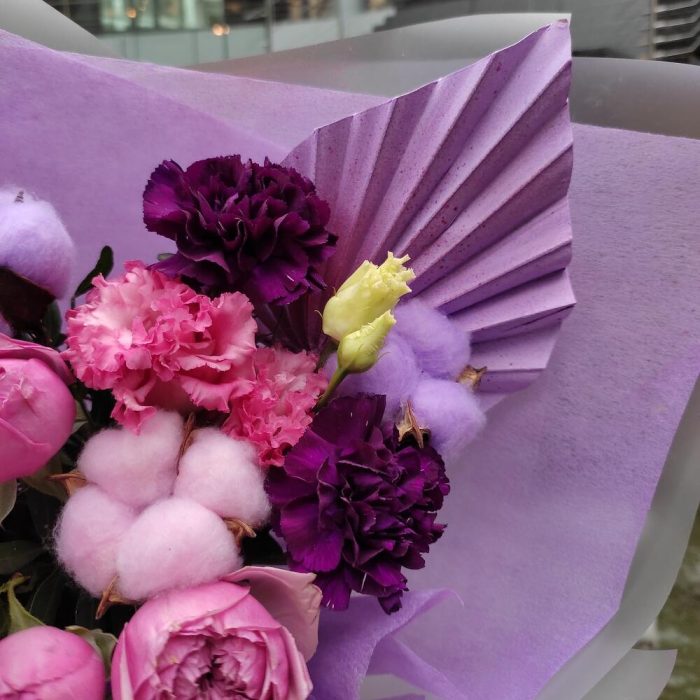 Лизиантус – 1 шт.Хлопок – 6 шт.Диантус – 2 шт.Роза кустовая пионовидная – 1 шт.Пальма – 1 шт.Лента – 2 шт.Упаковка дизайнерская – 2 шт.