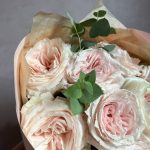 Эвкалипт – 5 шт.Атласная лента – 1 шт.декоративная упаковка – 1 шт.пионовидная роза тсумуги – 11 шт.
