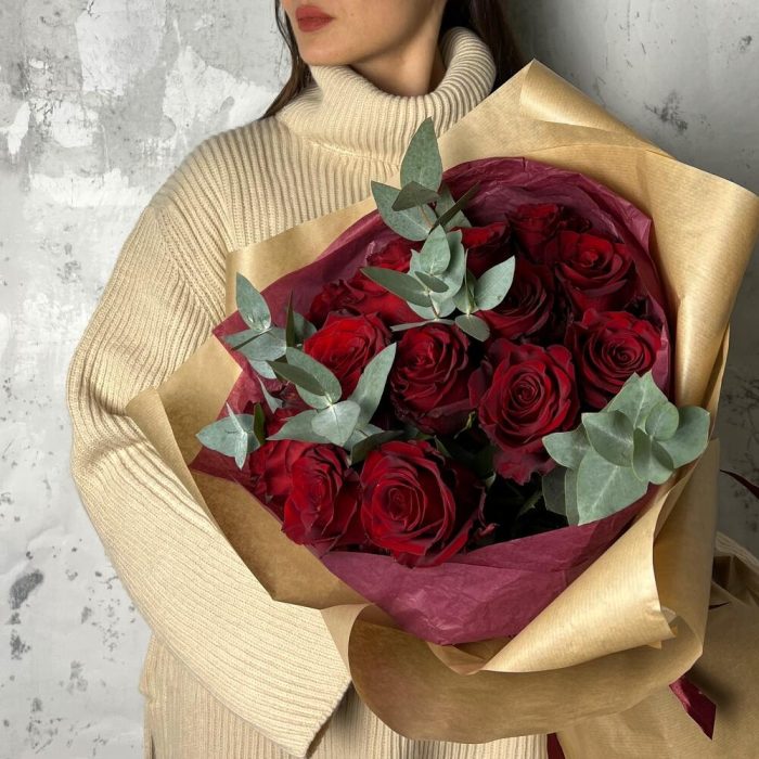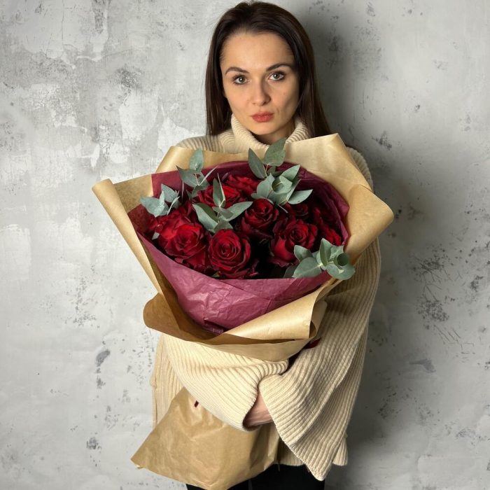 роза эваадор 60 см – 15 шт.Эвкалипт – 5 шт.Упаковка дизайнерская – 3 шт.Лента атласная – 1 шт.