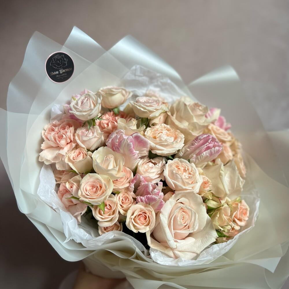 Букет с кустовыми розами, тюльпанами и диантусами