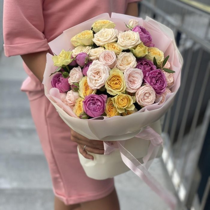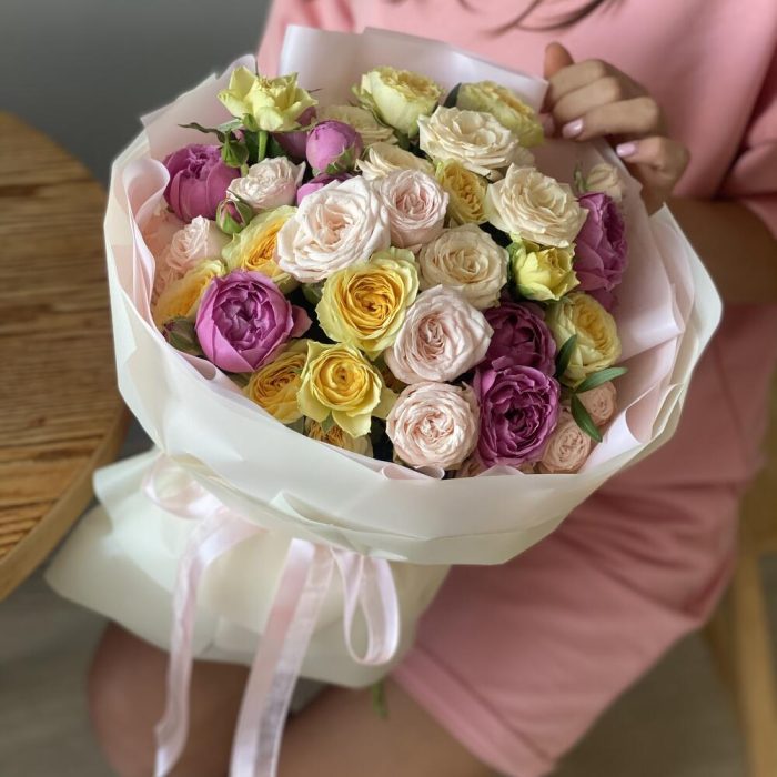 Букет Юбилейный из кустовых пионовидных роз и хризантемы