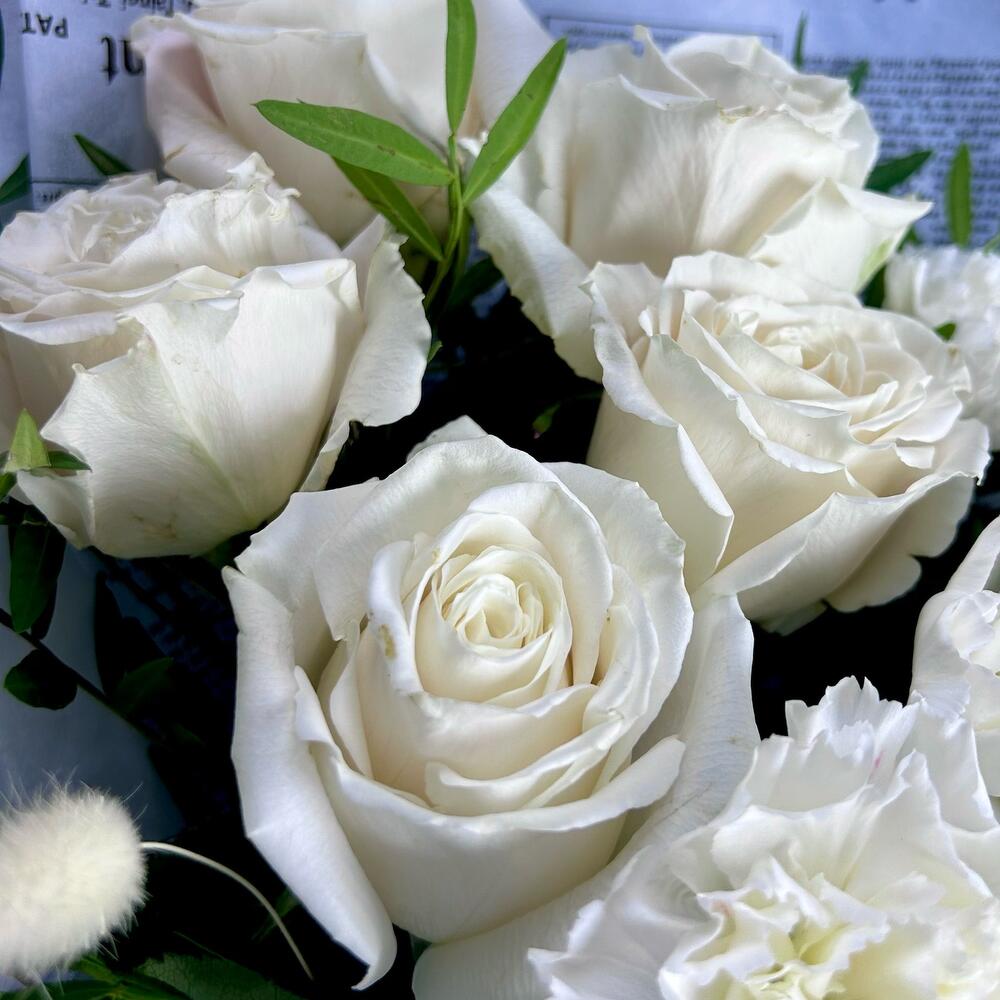 Гвоздика одноголовая – 6 шт.роза премиальная пионовидная «плая бланка» – 5 шт.Лагурус (сухоцвет) – 3 шт.Фисташка – 3 шт.Упаковка дизайнерская – 1 шт.