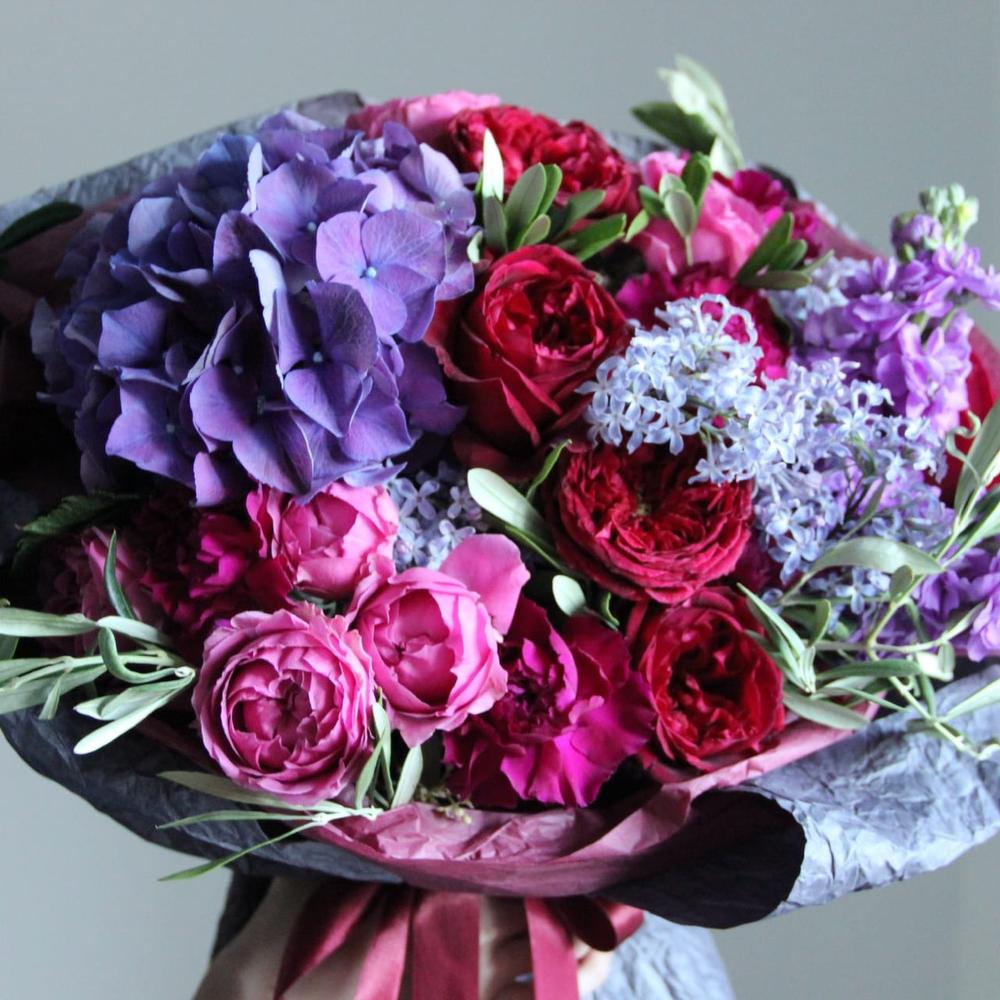 Маттиола – 4 шт.Роза пионовидная – 7 шт.Роза пионовидная кустовая – 3 шт.Гвоздика – 5 шт.Олива – 5 шт.Гортензия – 1 шт.Упаковка – 1 шт.