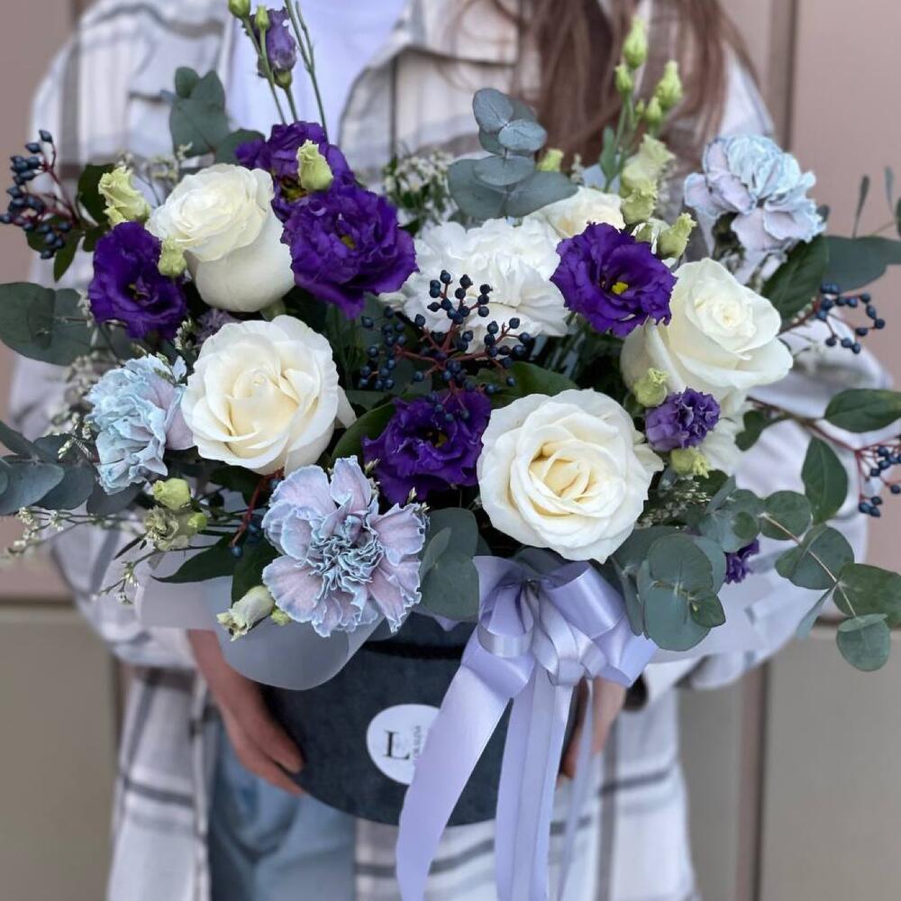 Вибурнум – 3 шт.Эвкалипт – 3 шт.Роза Эквадор – 6 шт.Эустома – 2 шт.Гвоздика белая – 3 шт.Шляпная коробка – 1 шт.Оазис флористический – 1 шт.гвоздика крашенная – 5 шт.