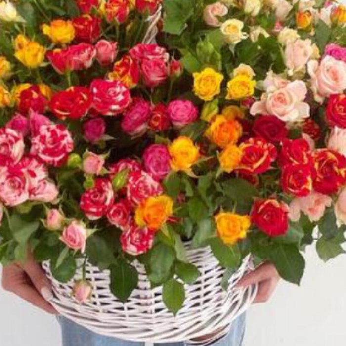 Роза кустовая – 81 шт.Корзина плетеная – 1 шт.Оазис флористический – 3 шт.