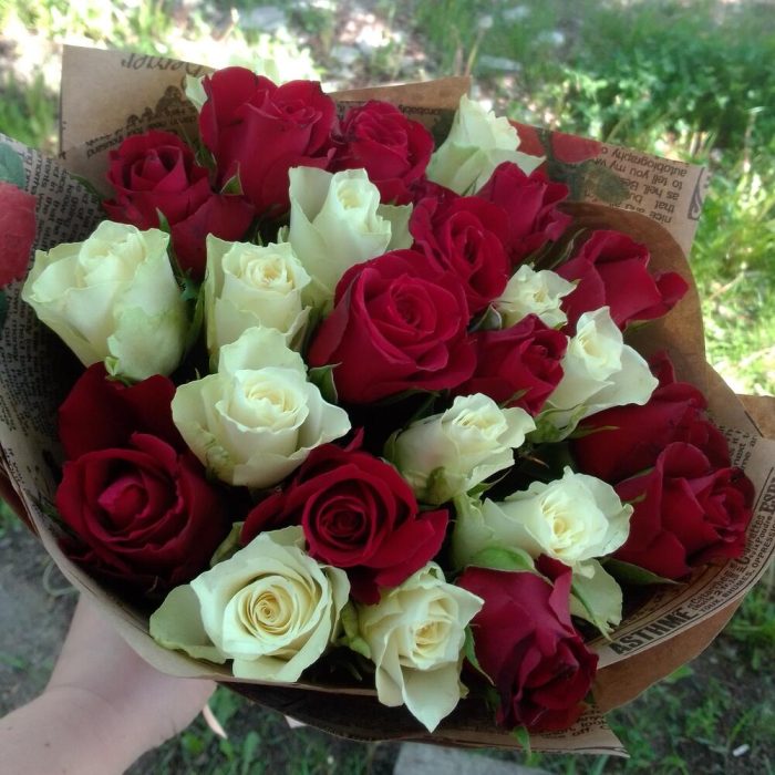 Роза красная – 16 шт.Роза белая – 15 шт.Крафт упаковка – 1 шт.