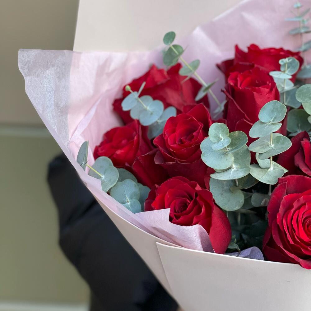 Эвкалипт – 3 шт.Роза Эквадор – 9 шт.Лента атласная – 1 шт.Тишью – 2 шт.Фоамиран (упаковка) – 1 шт.