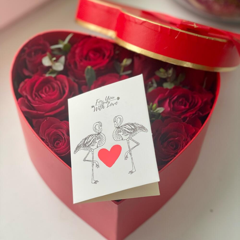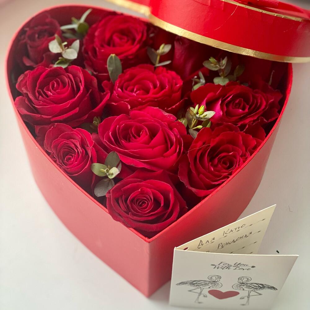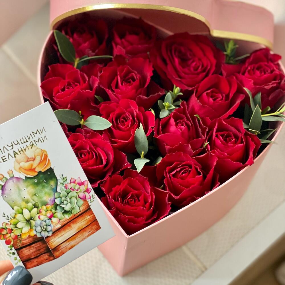 Коробка сердце – 1 шт.Фисташка пучок – 1 шт.Оазис флористический – 1 шт.Роза красная одноголовая – 13 шт.