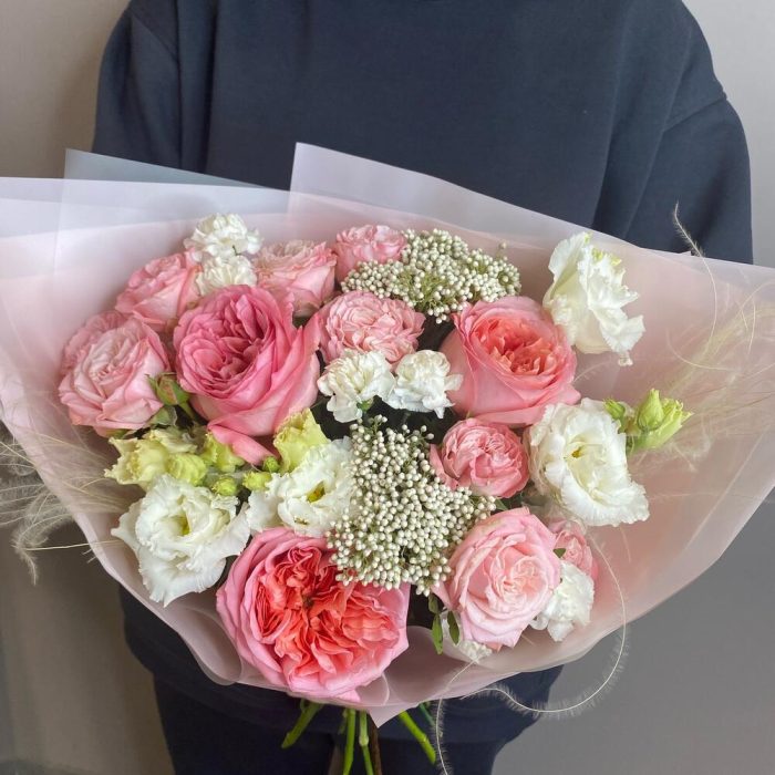 Лизиантус – 2 шт.Озотамнус – 2 шт.Гвоздика кустовая – 3 шт.Фисташка – 1 шт.Роза пионовидная – 3 шт.Роза кустовая пионовидная – 3 шт.Упаковка дизайнерская – 2 шт.Стифа – 2 шт.комплимент от polyanka – 1 шт.