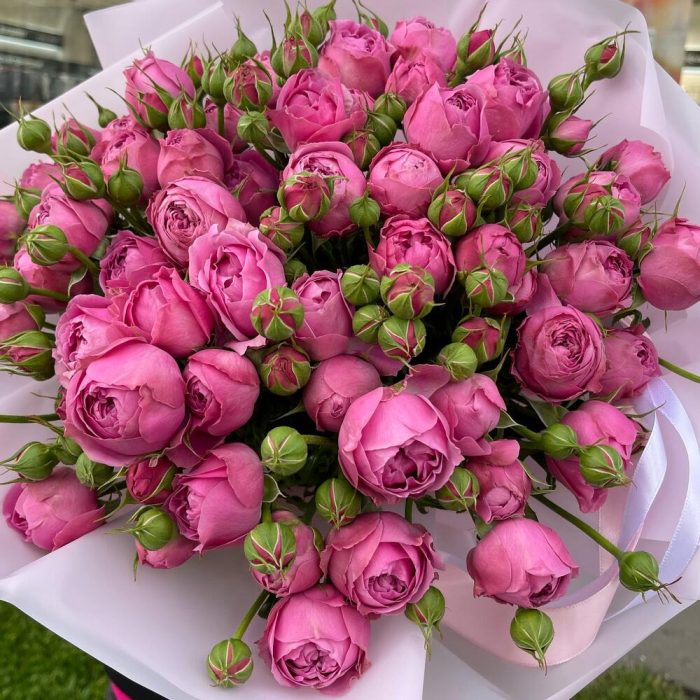 упаковка дизайнерская пленка – 5 шт.бант атласный двойной – 1 шт.пионовидная роза кустовая Misty Bubbles – 19 шт.