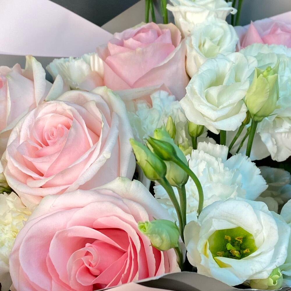 Роза Эквадор – 7 шт.Лизиантус – 4 шт.Диантус сортовой – 5 шт.Упаковка дизайнерская – 3 шт.Лента атласная – 1 шт.