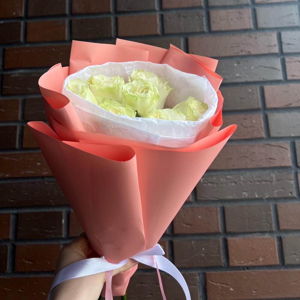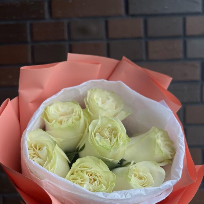 Атласная лента – 2 шт.Пионовидная роза белая – 7 шт.Авторская упаковка – 5 шт.